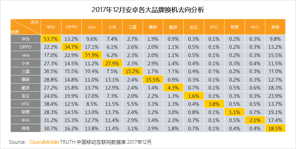 2017年12月,华为用户换机忠诚度较高,三星换机流向三星占比仅为15.2%