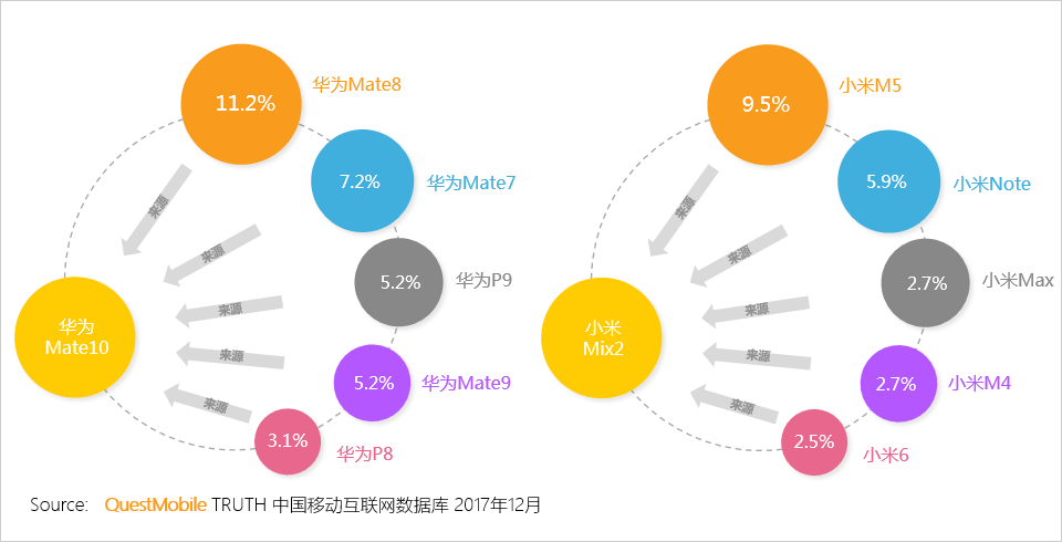 2017年12月,华为新旗舰系列Mate10较多用户来自于本系列的Mate8、Mate7以及Mate9,其次为相近的P系列,用户的来源较集中。对于小米,新旗舰机型从品牌角度均主要集中在本品牌,但是来源于不同的系列,这是对于用户资源的重新汇聚。