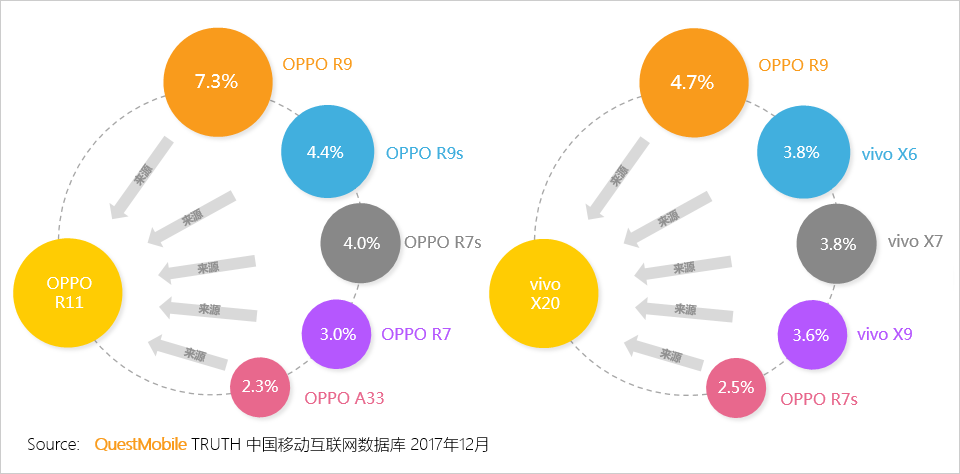 OPPO旗舰机型用户也主要来源于本品牌,但vivo有较多来自于兄弟公司OPPO