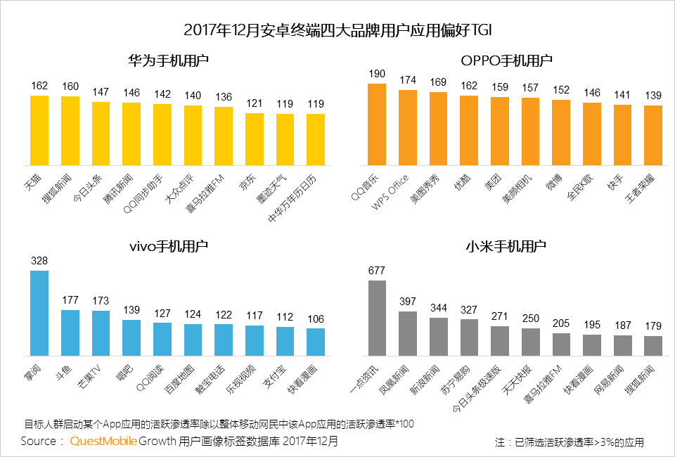 根据QuestMobile数据,安卓四大终端品牌用户的行为偏好和应用偏好存在较大差异。