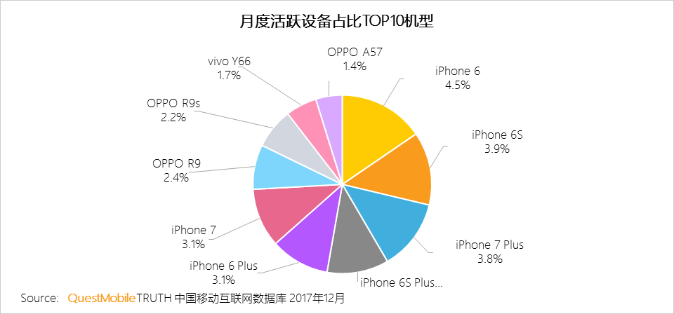 Top10智能终端的用户占比约30%,与去年基本一致。TOP6机型均为苹果手机,苹果之前霸主地位的影响仍延续到现在。除了苹果之外,OPPO也占据了三席,OPPO R9系列铺天盖地的广告,让这系列手机在中国市场热卖,抢夺了中高端市场的份额。