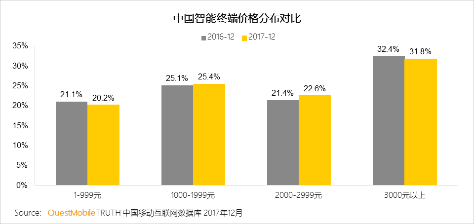 由于苹果手机出厂价基本为3000元以上,所以终端价格仍较集中在这个区间,其他价格段分布较平均,1000-1999元占比稍多。对比2016年,2017年1000-1999元以及2000-2999元用户占比有所上升,其中2000-2999元占比提升较大,主要各大安卓品牌的主打机型系列均集中在这个价位端,这些机型的出货表现较好。