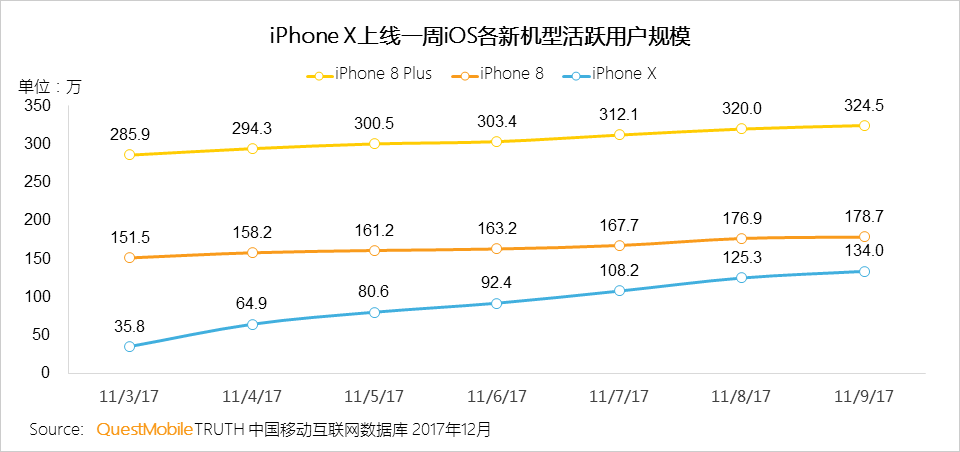 2017年万众期待的苹果旗舰机型iPhone X虽然具备领先的人脸识别技术以及一流的计算单元,但高昂的售价,以及“齐刘海”的外形,也被较多果粉诟病。iPhone X上线以后,活跃设备量仅有134万,与iPhone6上线初的万众秒杀现象,的确不能相提并论。